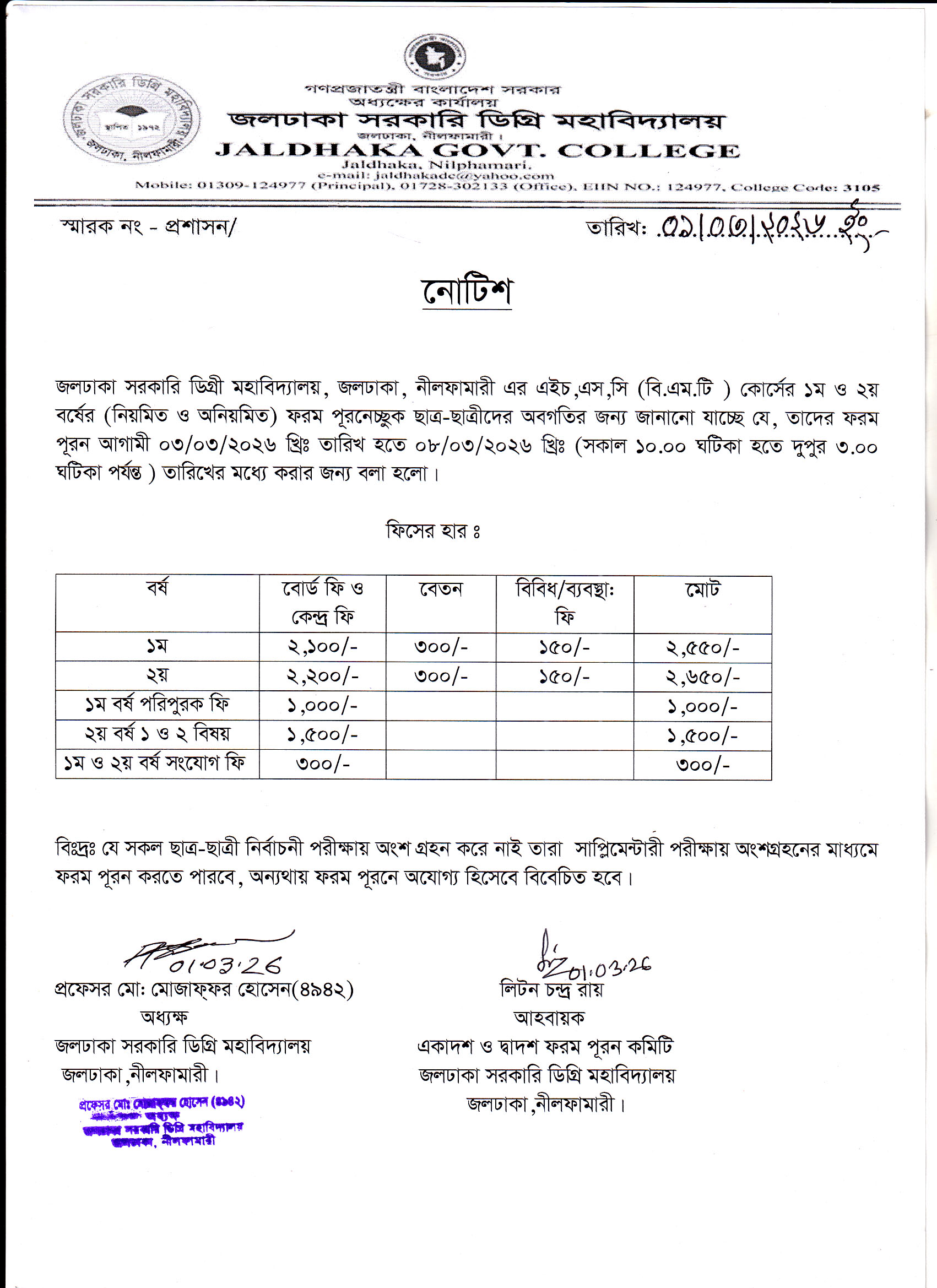 এইচ এস সি (বিএমটি) ১ম ও ২য় বর্ষের ফরম পূরণের নোটিশ।