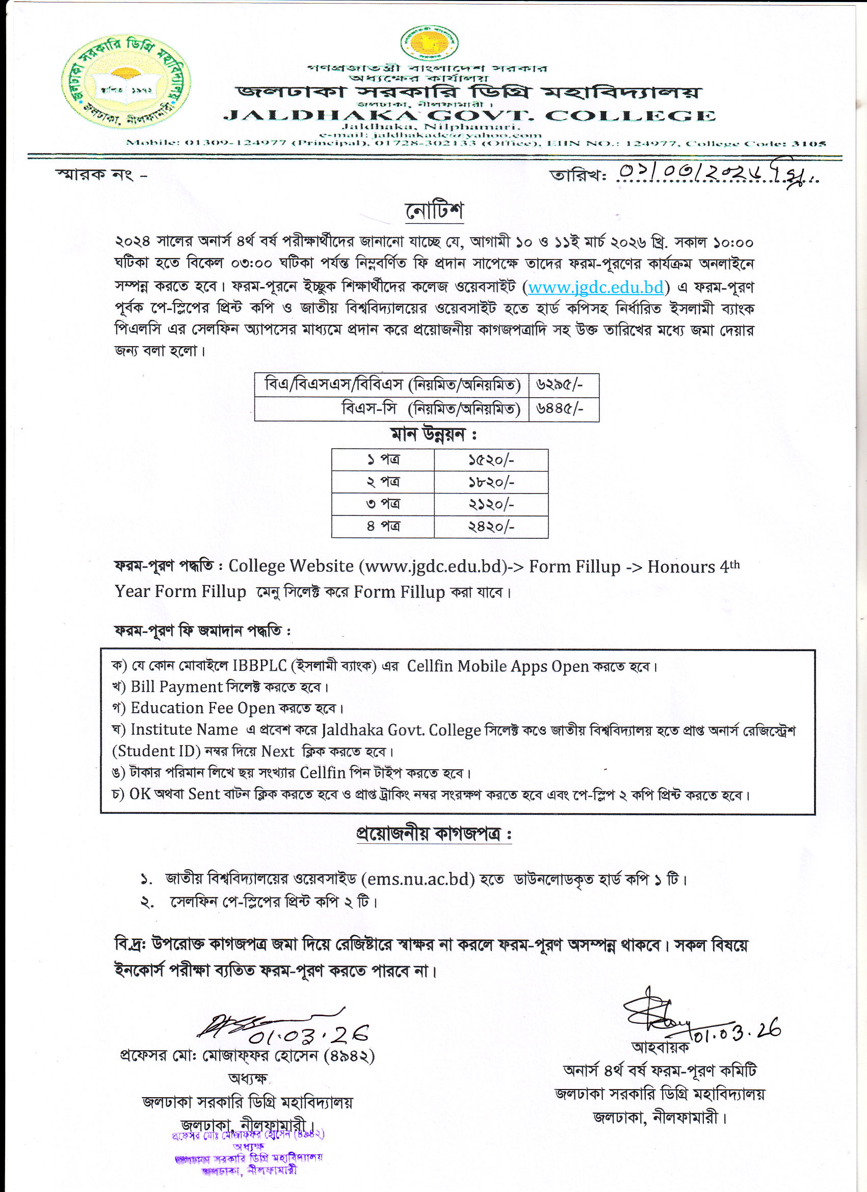 ২০২৪ সালের অনার্স ৪র্থ বর্ষ ফরম-পূরণের নোটিশ।