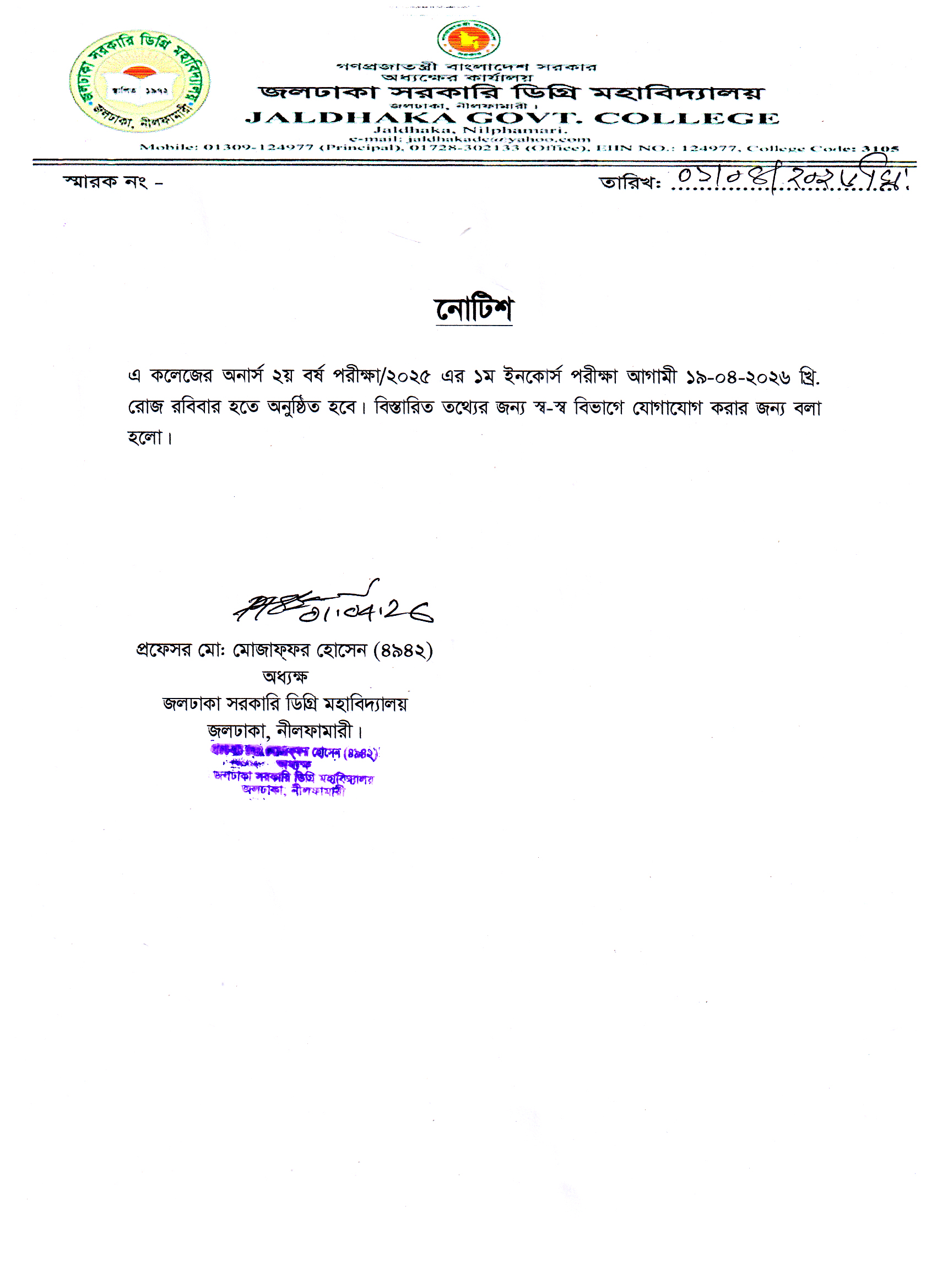 অনার্স ২য় বর্ষ পরীক্ষা/২০২৫ এর ১ম ইনকোর্স পরীক্ষার নোটিশ।