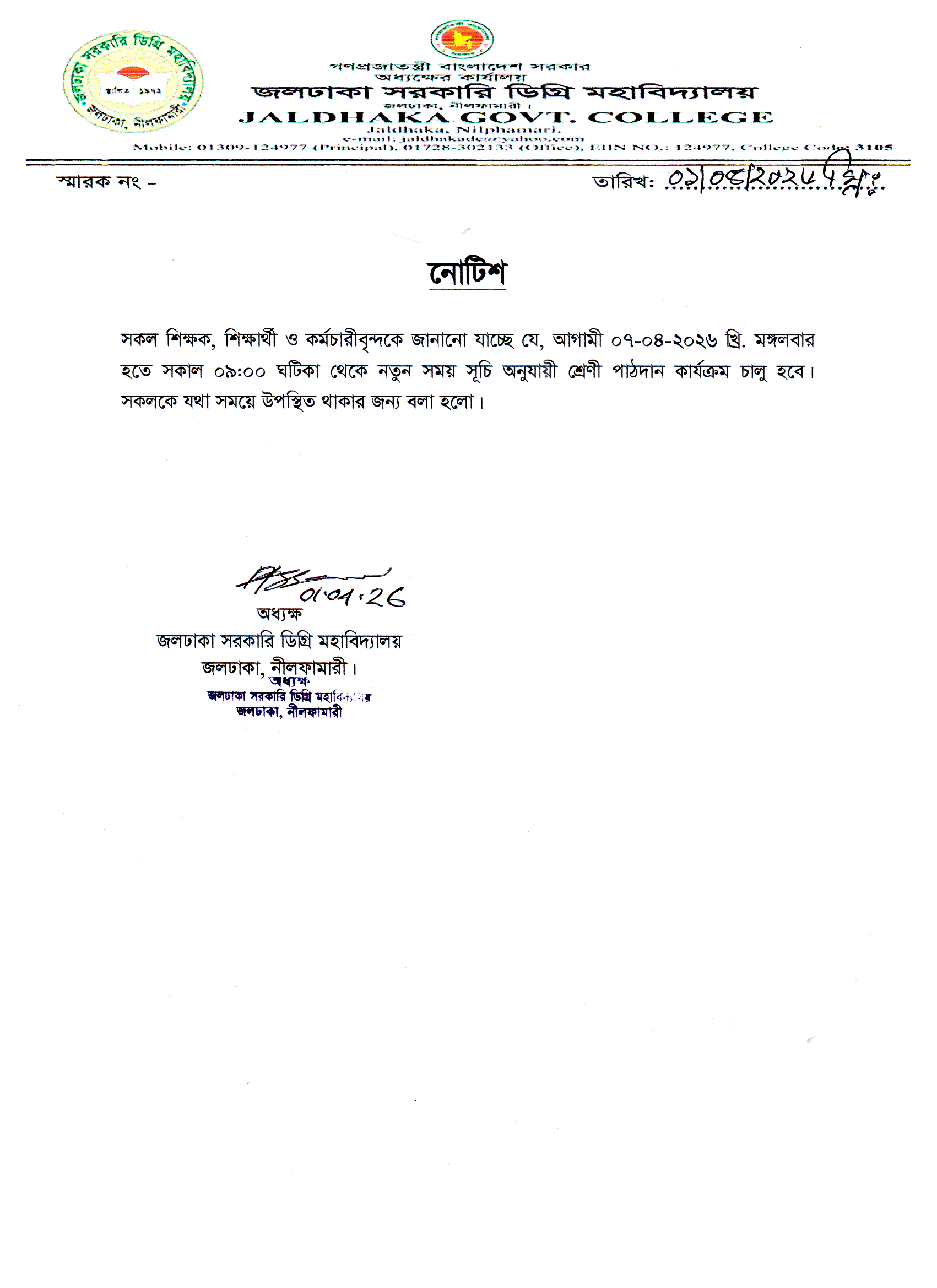 নতুন সময় সূচি অনুযায়ী শ্রেণী পাঠদান সংক্রান্ত নোটিশ।