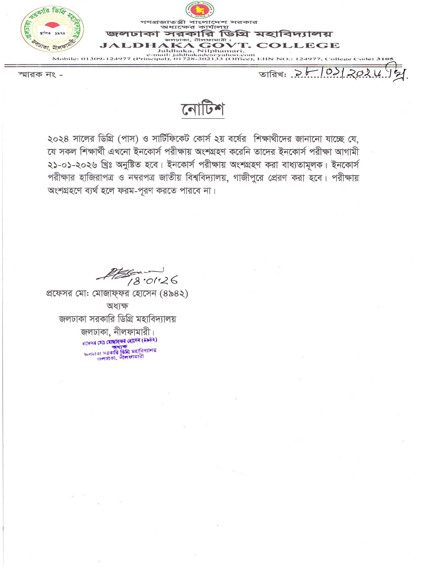 ২০২৪ সালের ডিগ্রি (পাস) ও সার্টিফিকেট কোর্স ২য় বর্ষের ইনকোর্স পরীক্ষার নোটিশ। |