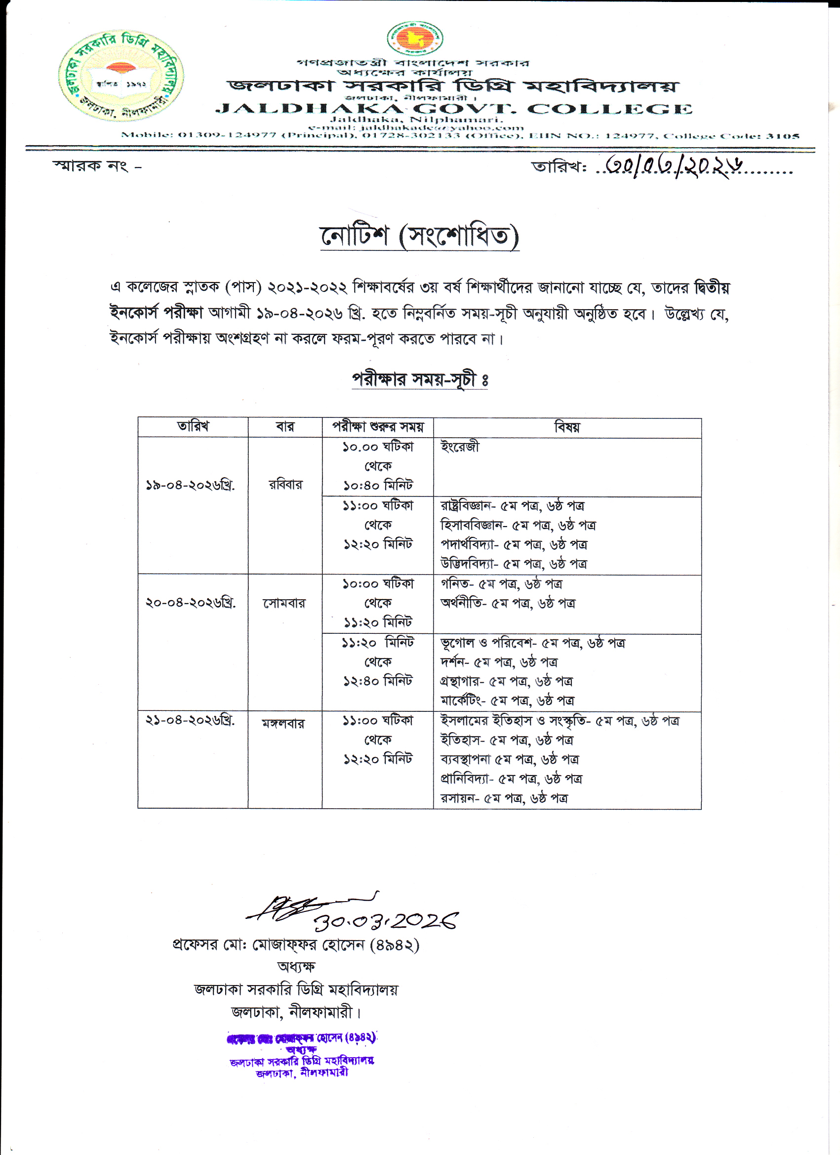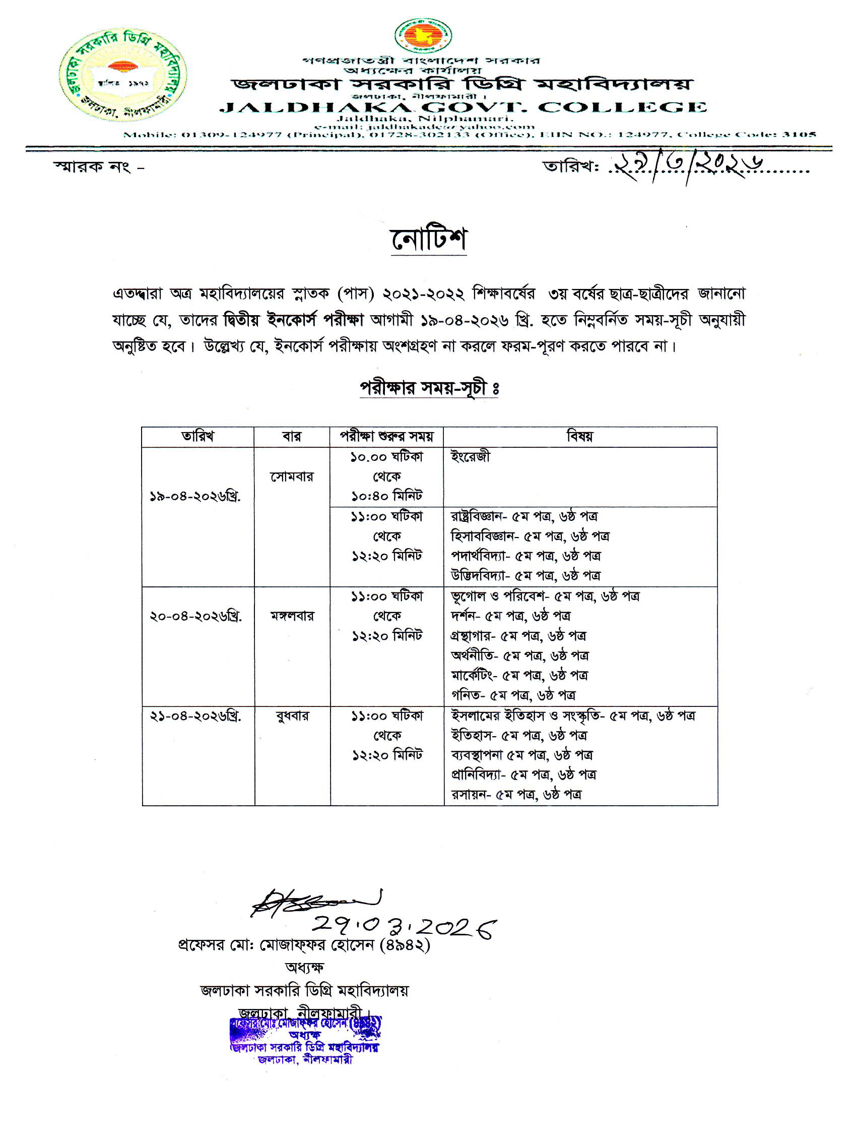 স্নাতক (পাস) ২০২১-২০২২ শিক্ষার্বষ ৩য় বর্ষের ২য় ইনকোর্স পরীক্ষার সংশোধিত নোটিশ। |