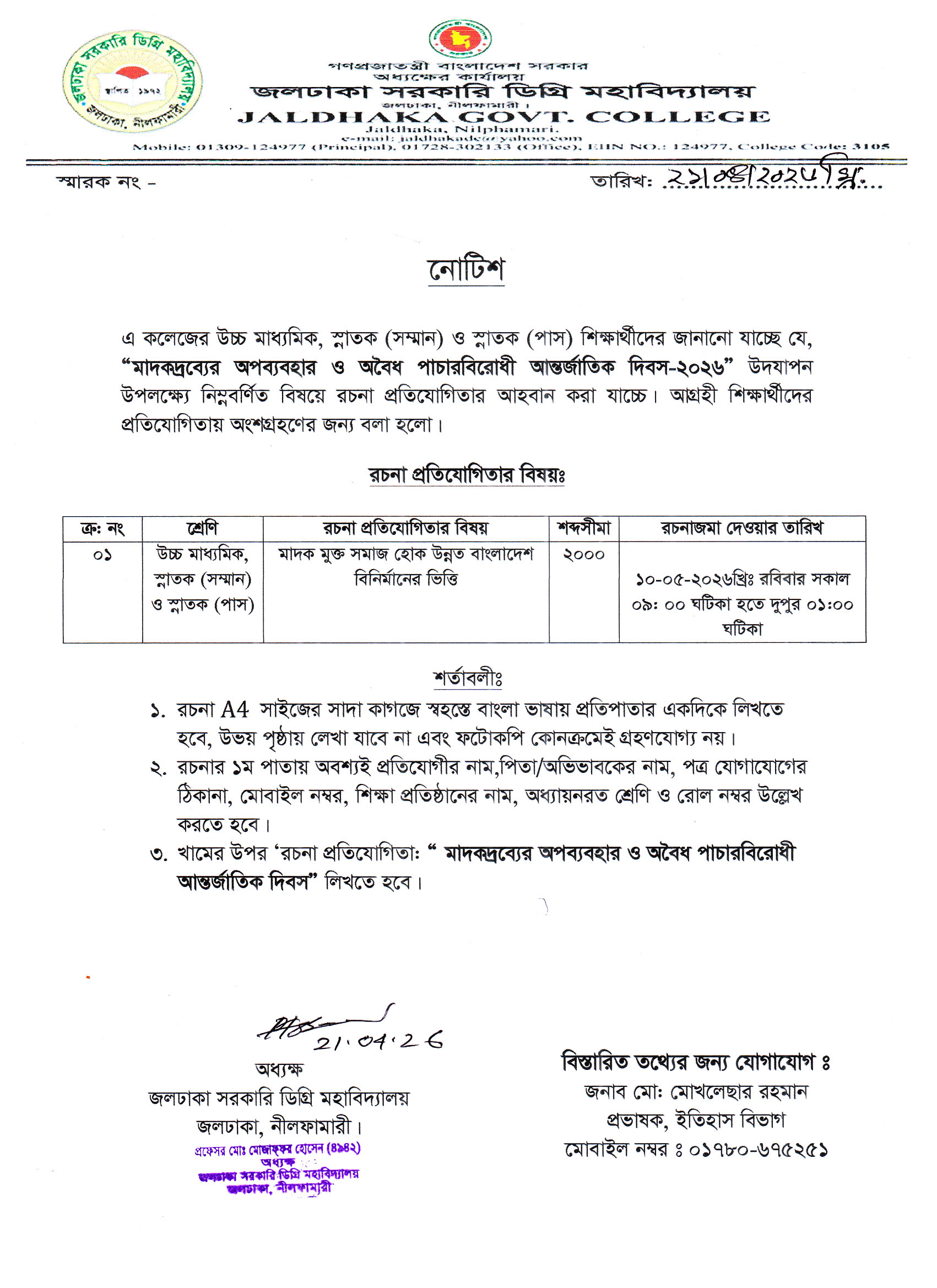 মাদকদ্রব্যের অপব্যবহার ও অবৈধ পাচারবিরোধী আন্তর্জাতিক দিবস-২০২৬ উদযাপন উপলক্ষ্যে রচনা প্রতিযোগিতা। |